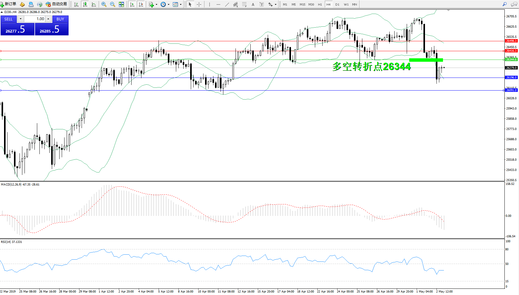 道琼斯指数DJ30—— 4小时K线图显示: