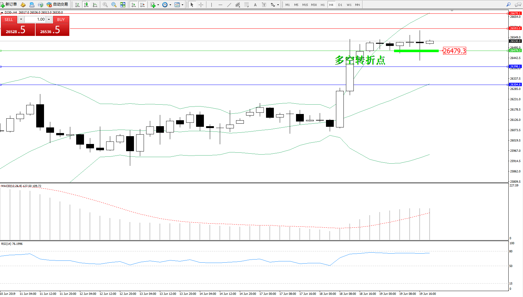 道琼斯指数DJ30—— 4小时K线图显示: