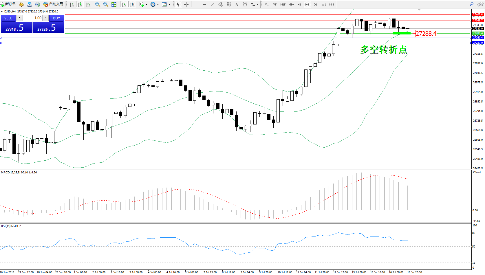 道琼斯指数DJ30—— 4小时K线图显示: