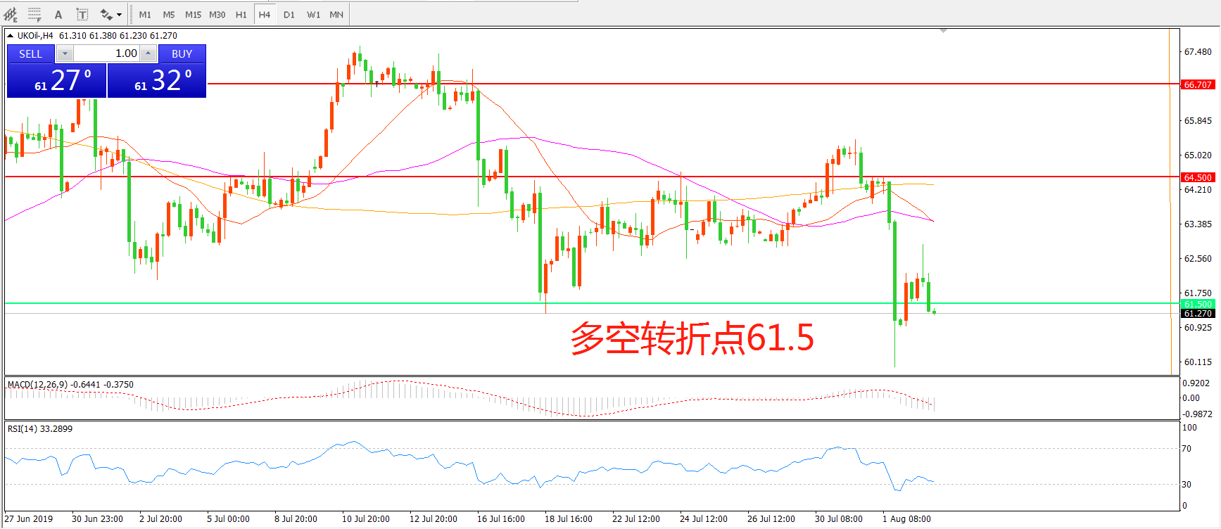 交易策略:在61.50之下看跌,目标57.50   53.50