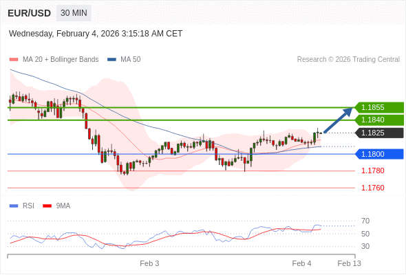 在 1.1800 之上,看涨,目标价位为 1.1840 ,然后为 1.1855 。