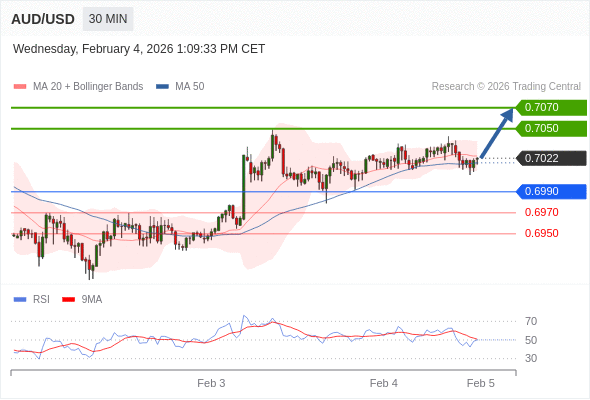在 0.6990 之上,看涨,目标价位为 0.7050 ,然后为 0.7070 。