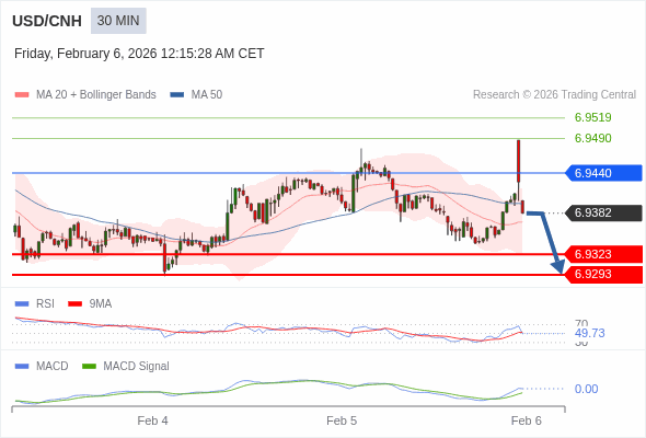 交易策略: 当 6.9440 维持阻力位时,存在回归 6.9293 的风险。