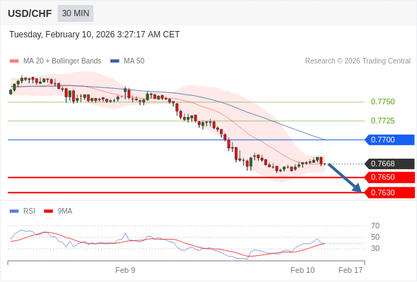 在 0.7700 之下,看跌,目标价位为 0.7650 ,然后为 0.7630 。