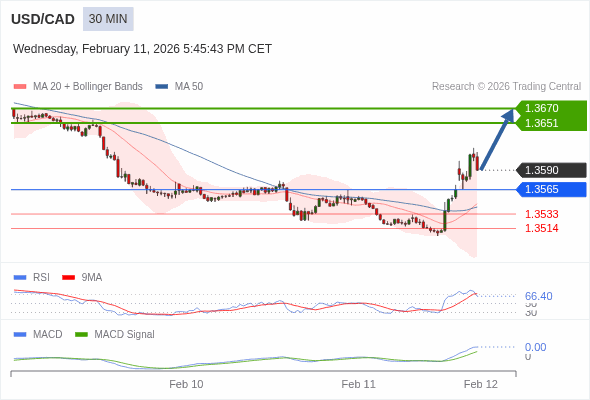 美元/加元 当日内 : 看涨,当 1.3565 为支撑位。