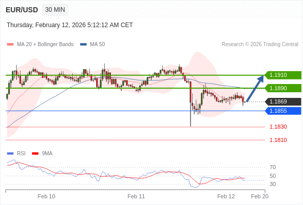 在 1.1855 之上,看涨,目标价位为 1.1890 ,然后为 1.1910 。