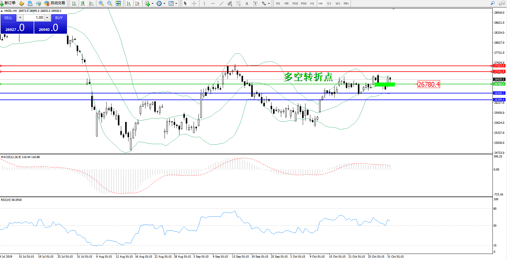 香港恒生指数1031日(周四)收盘上涨239.01点,涨幅0.90%,报26906.72点;港股高开40点后逐步扩大升幅,主要为汇丰银行跟随下调最优惠利率八分之一厘,为近11年首次。消息刺激恒指急升,再冲上27009高位,最多升341点。随后续在高位横行。美联储隔夜年内第三次降息25基点,各国央行将迎一波降息潮,给恒指市场流动性带来正面支持。美联储降息已经不是什么大新闻了,其暗示将暂停降息,似乎也没什么新意了。