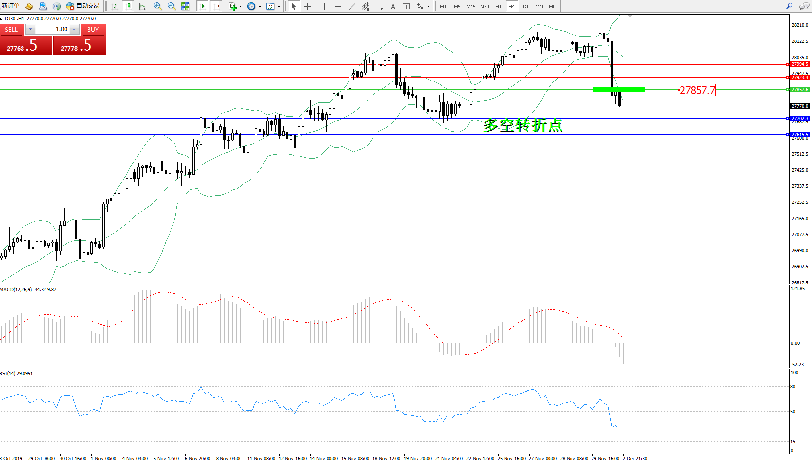 道琼斯指数DJ30—— 4小时K线图显示:
