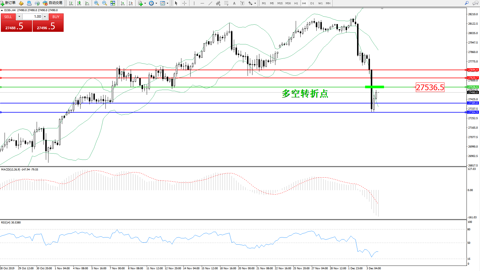 道琼斯指数DJ30—— 4小时K线图显示:
