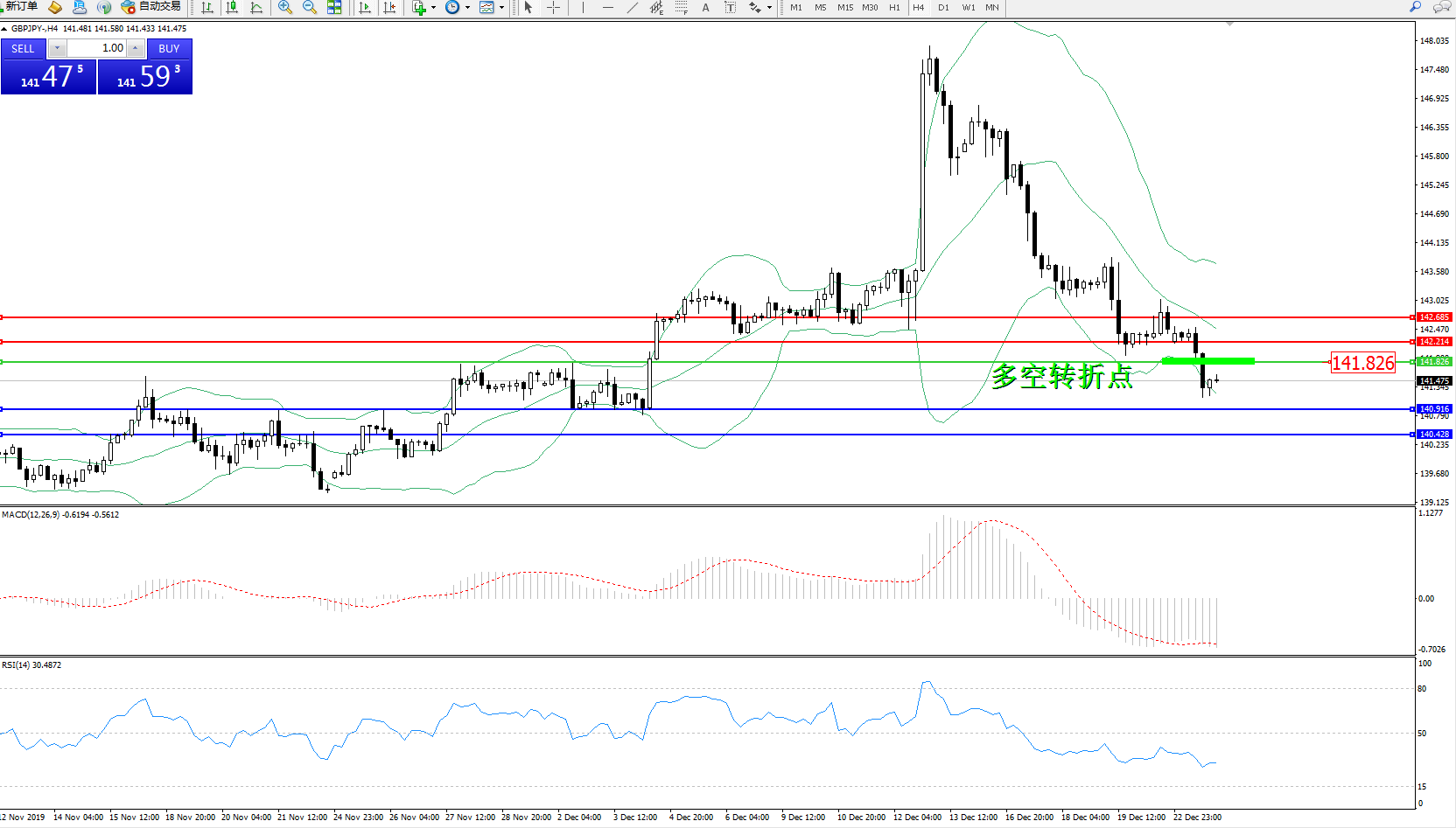 交易策略:141.826下方看跌,目标140.916140.428