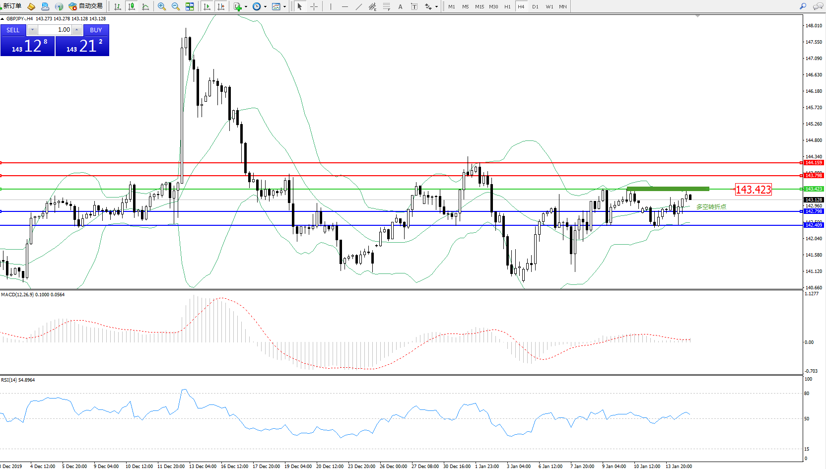 交易策略:143.423下方看跌,目标142.798142.429