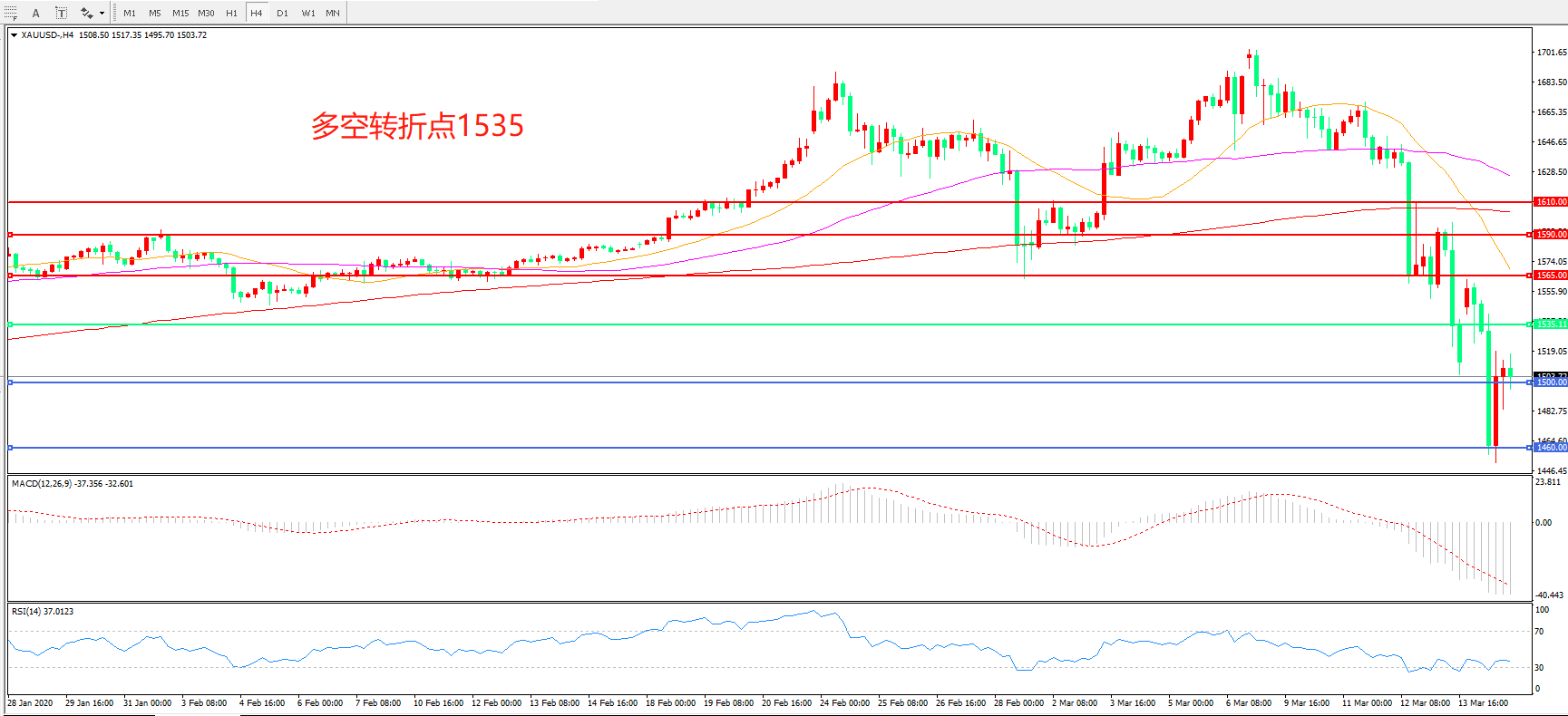 交易策略:在1535.00之下看跌,目标1500.00   1460.00