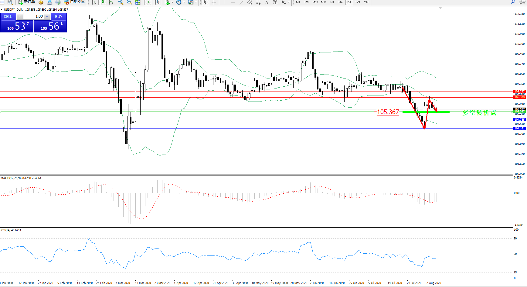 技术点评:高位空头动力延续布林带指标下轨持续弱势下行数日后,低位抵达104.161附近出现快速回升至布林带指标中轨附近整理,触及中轨后开始再度弱势下移,抵达转折点附近开始徘徊,布林带指标呈张口走势后以后收口迹象且下行趋势有形成态势,MACD指标处于0轴线下方空头区域弱势整理震荡下移后开始平移,RSI指标处于空头动力持续震荡下移后出现快速拉升走势;