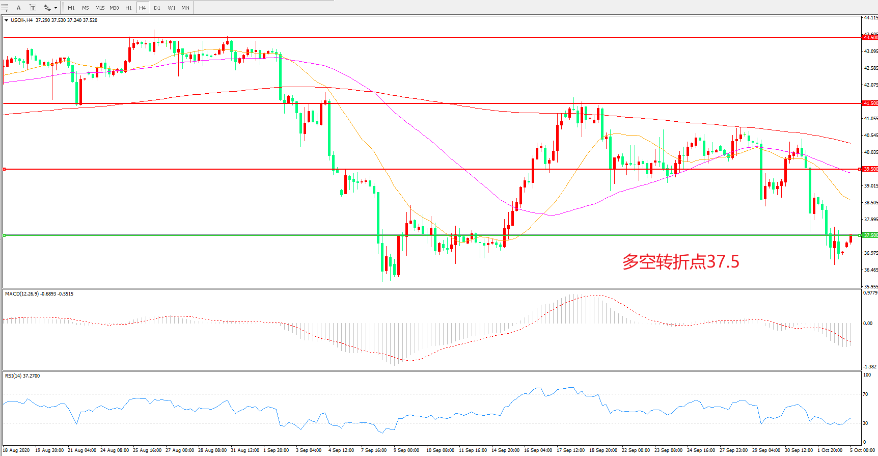 4小时图看,油价回踩37.5后连续拉升,短期走势有所回暖,但反弹高点依然逐阶降低,200均线成为中期明显阻力,MACD红柱增加,RSI指标走平,日内延续震荡概率较大。