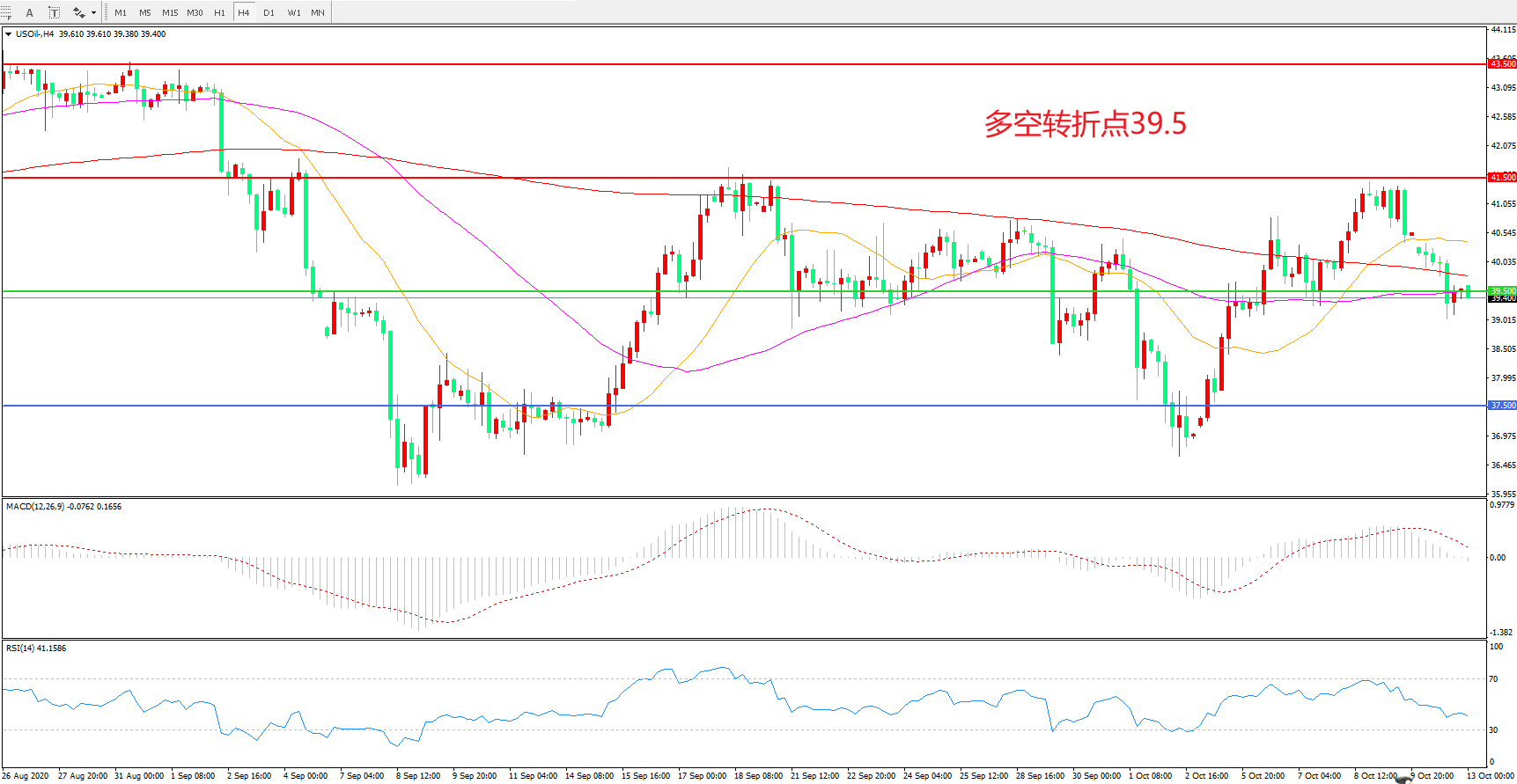 4小时图看,油价触及41.5阻力后震荡下行,短期走势陷入低迷,200周期均线再次被跌破,MACD红柱减少,RSI指标走平,日内延续震荡概率较大。