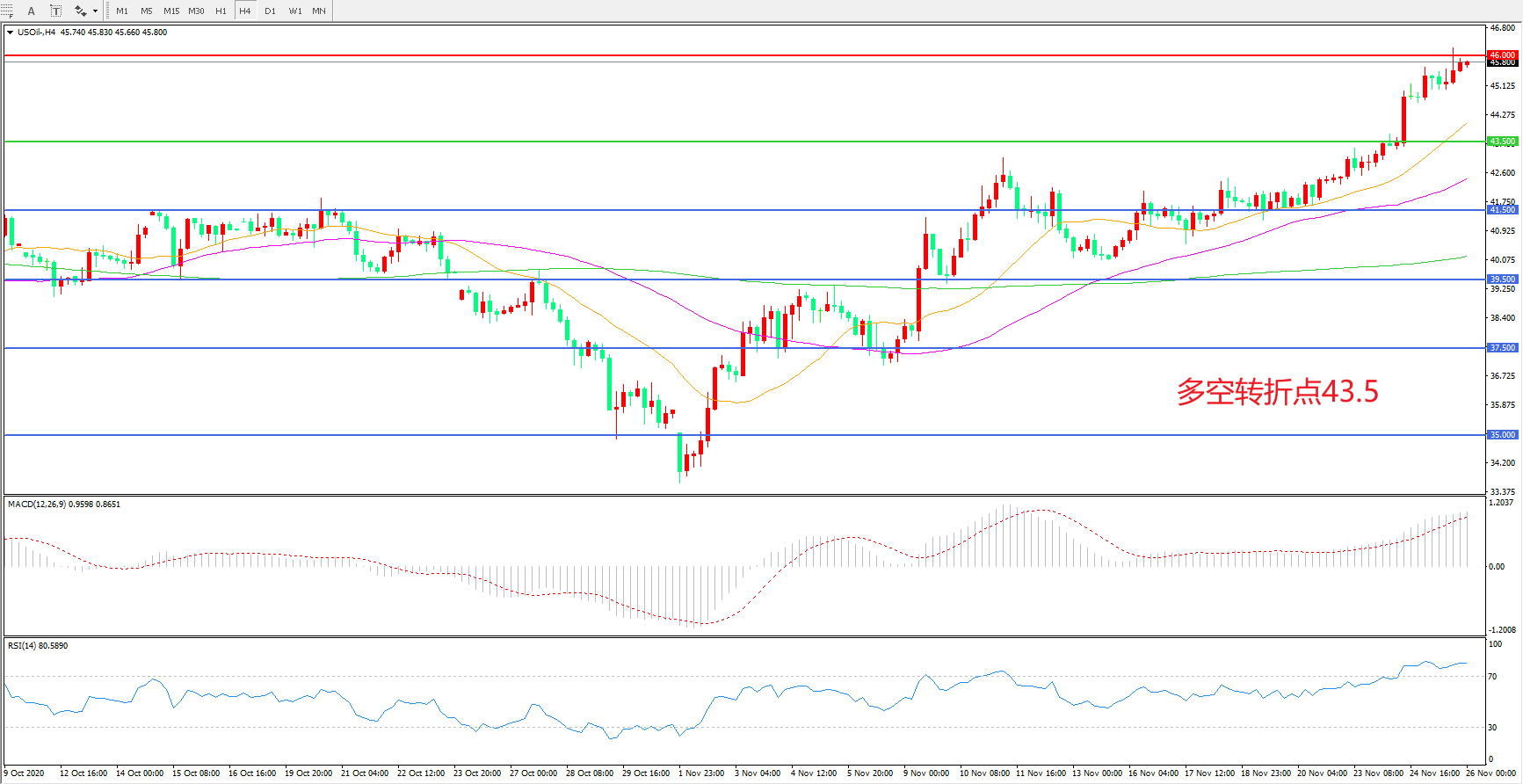 4小时图看,油价长阳拉升,突破前期整理区间,短期表现十分强势,46美元成为短期阻力,均线系统拐头向上,MACD红柱增加,RSI指标走平,日内震荡上行概率较大。