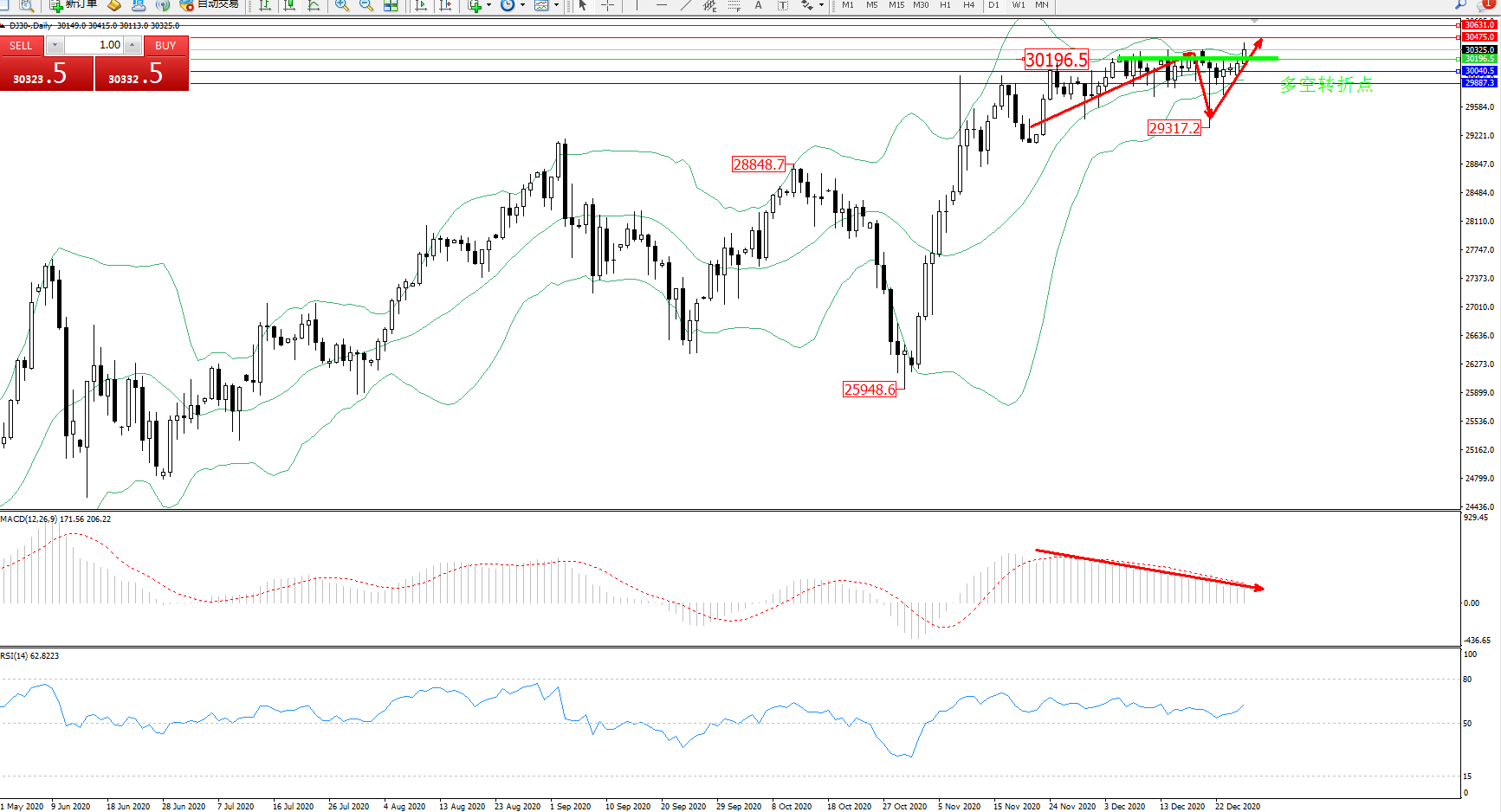 交易策略:30196上方看涨,目标30475、30631