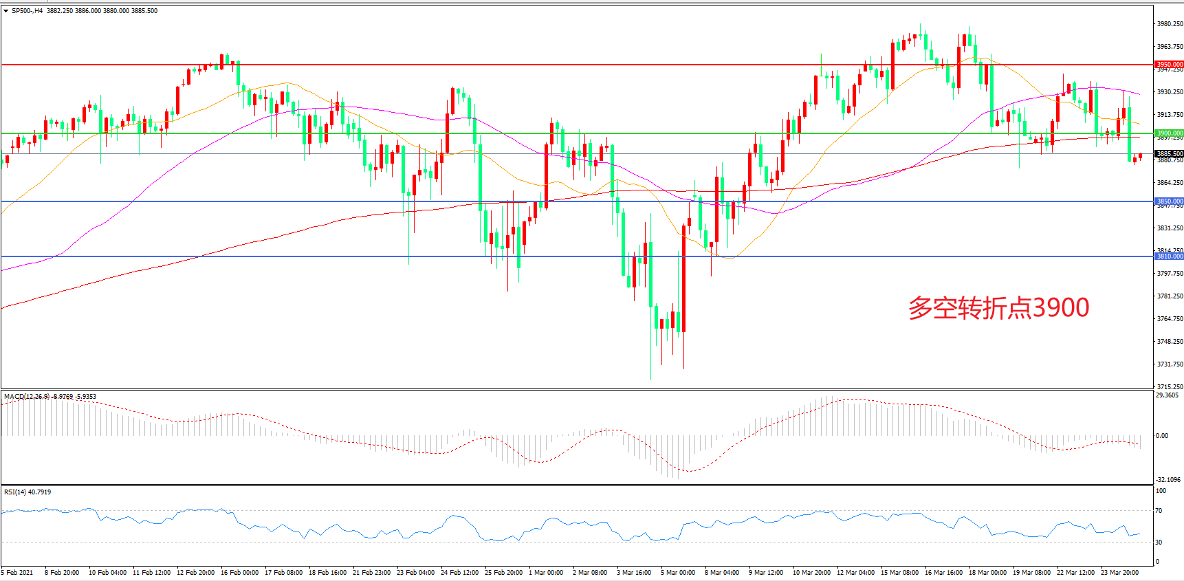 4小时图看,标普500先涨后跌,上行走势遭到破坏,55周期均线成为上方阻力,3850成为下方支撑,MACD绿柱增加,RSI指标走平,日内延续震荡概率较大。