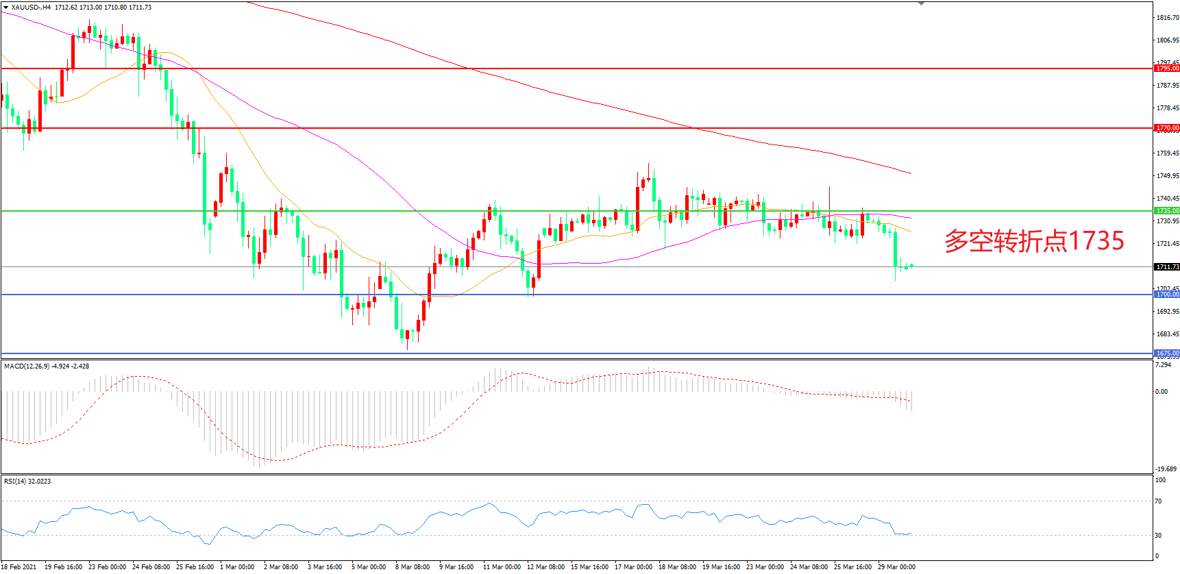 4小时图看,金价震荡整理后长阴下破,整体表现较为低迷,短期均线成为上方阻力,1700成为下方支撑,MACD绿柱增加,RSI指标走平,日内延续震荡概率较大。