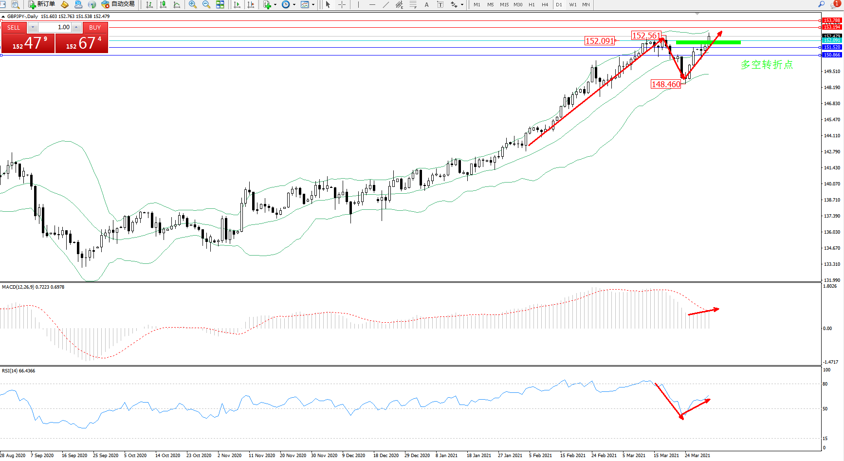 交易策略:152.091上方看涨,目标153.194、153.788