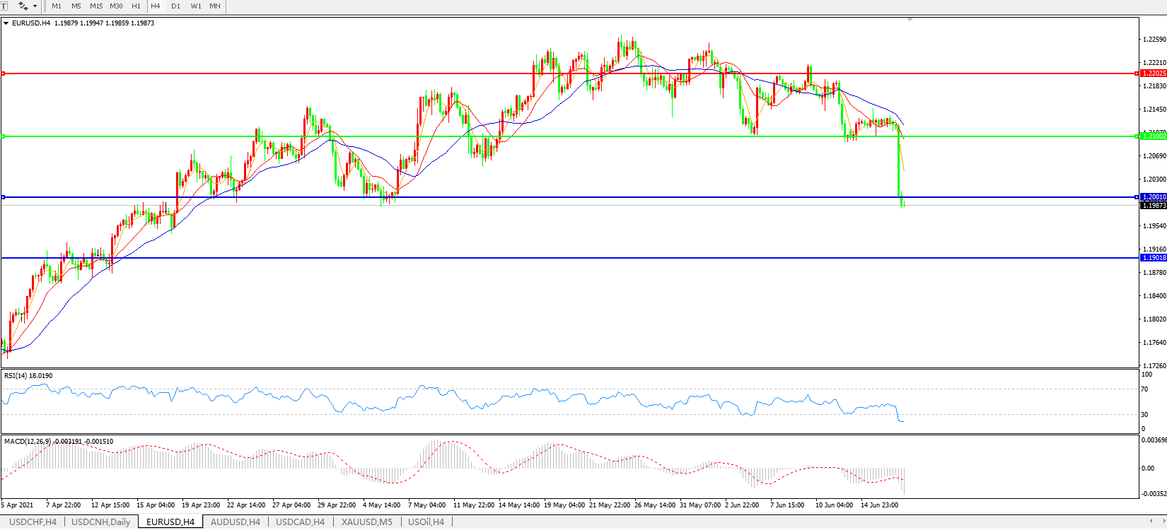 技术面简析:4小时图均线发散下行,汇价持续重挫,MACD下穿0轴且量能快速放量,RSI跳水,预计短期汇价大概率将在反弹整理后进一步下行。