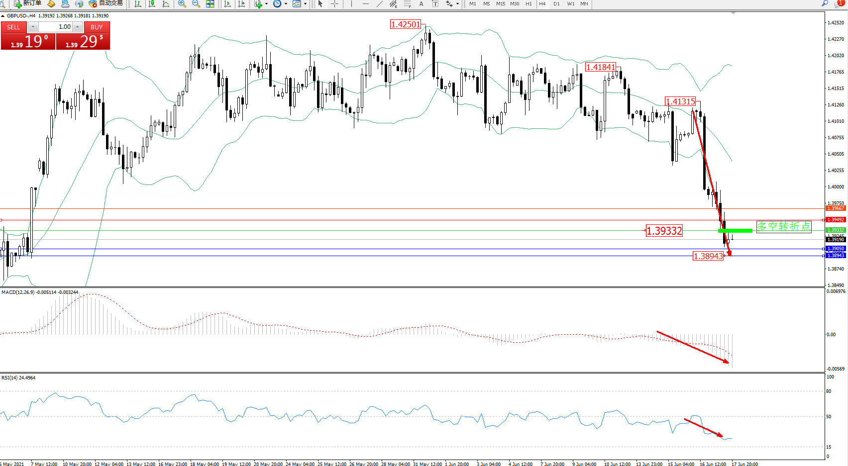 交易策略:1.39332下方看跌,目标1.39050、1.38943