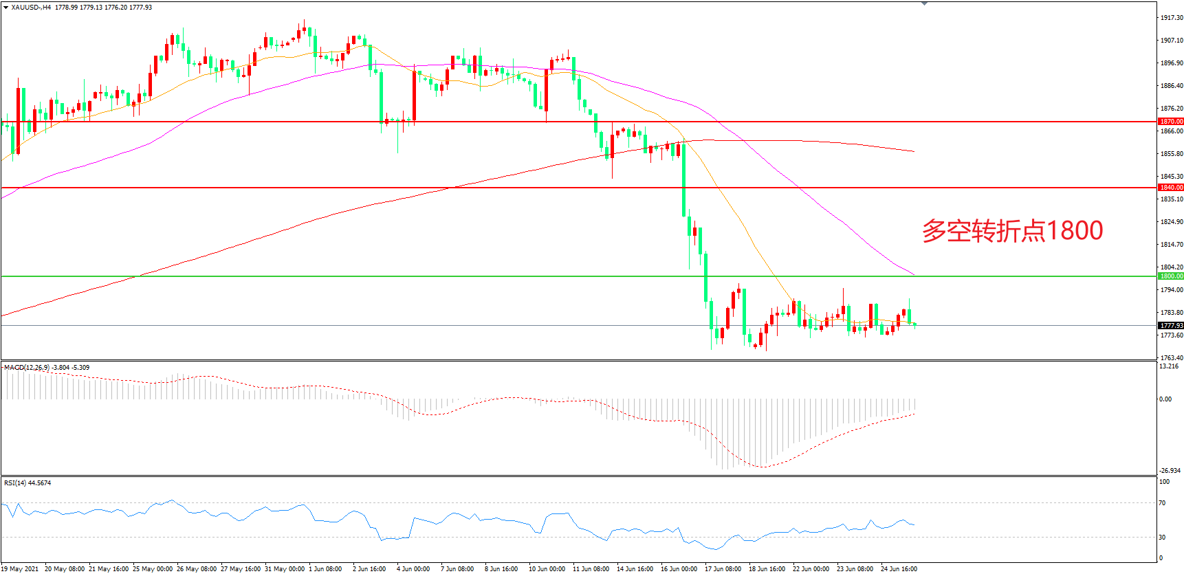 4小时图看,金价延续低位震荡,短线跌势有所缓解,但空头趋势依然明显,1800成为短期阻力,MACD绿柱缩短,RSI指标走平,日内震荡下行概率较大。