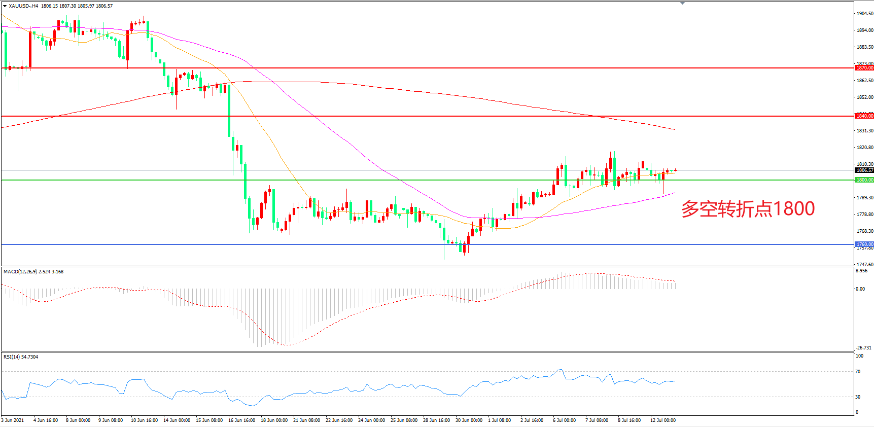 交易策略:  在1800.00之上看涨,目标1840.00        1870.00