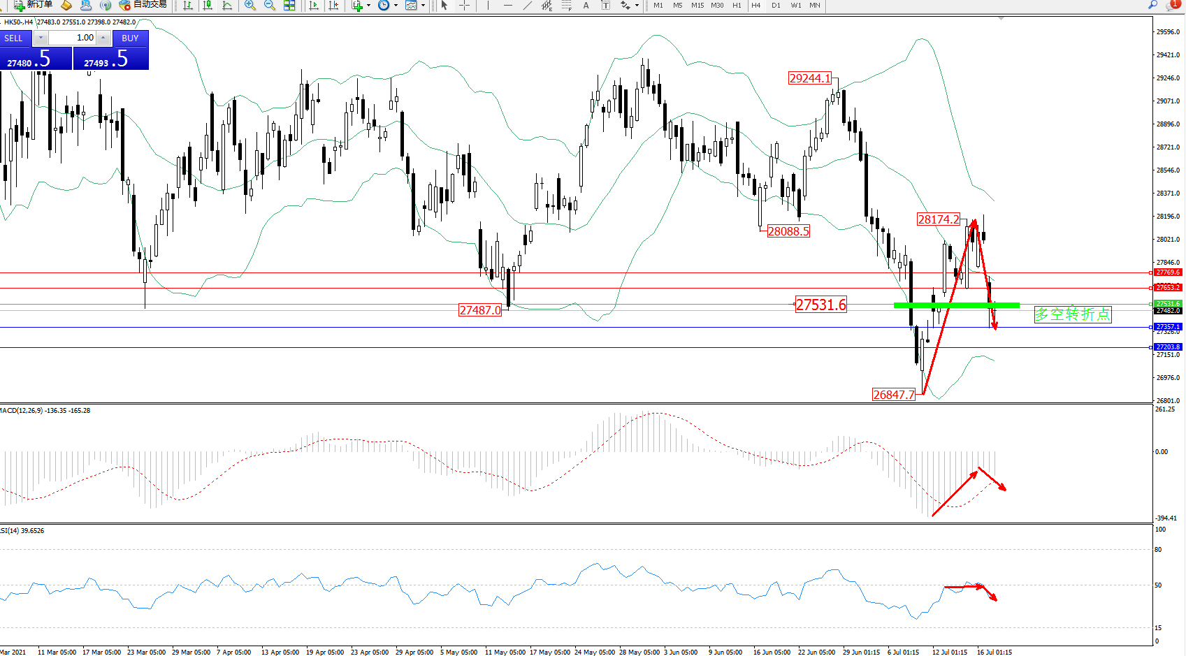 恒指HK50 ——4小时K线图显示: