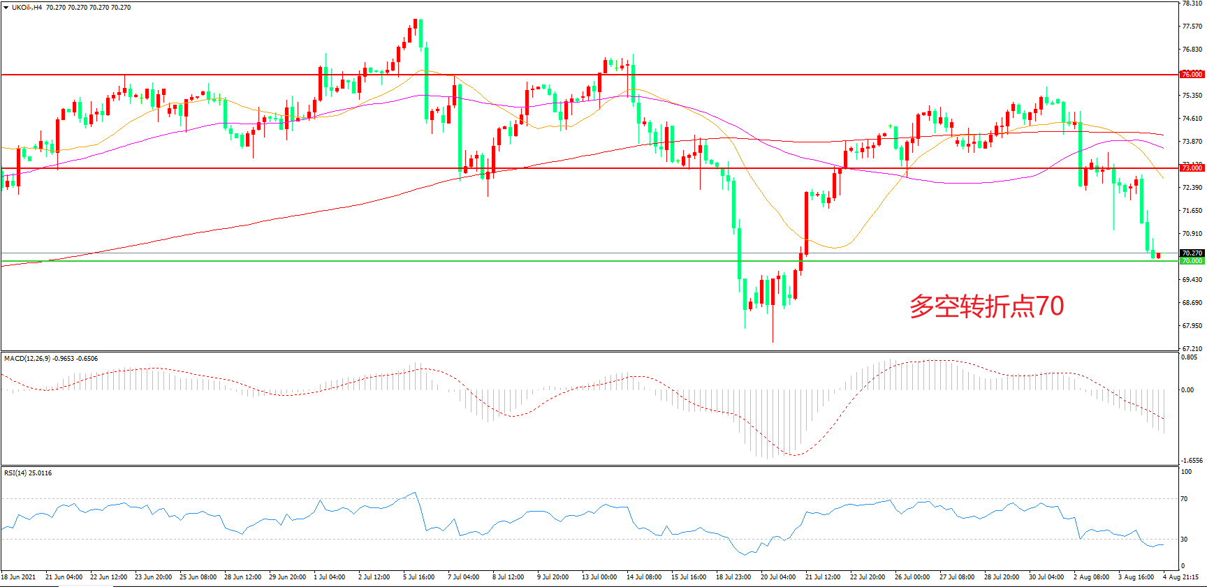 周三(8月4日),根据美国能源信息署公布的数据显示,当周EIA原油库存意外增加362.70万桶,原油库存的意外增加导致油价快速下行,布伦特原油震荡回落,收报70.27美元/桶。目前在疫情的扰动之下,需求端似乎有放缓的迹象,这是对多头最致命的打击,倘若需求端难以配合,那么多头也就基本失去了向上拉涨的动力,除非伊朗或者中东再出现比较大的变故,否则油价回落调整的概率较大。