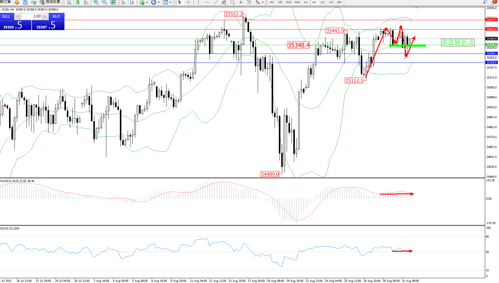 备选策略:35348下方看跌,目标35290、35228