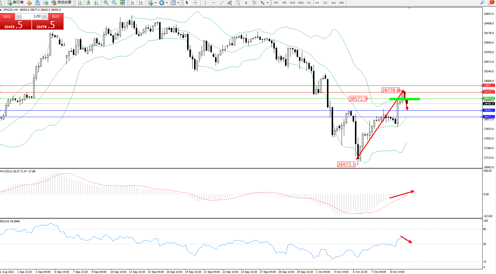 交易策略:28573下方看跌,目标28283、28127