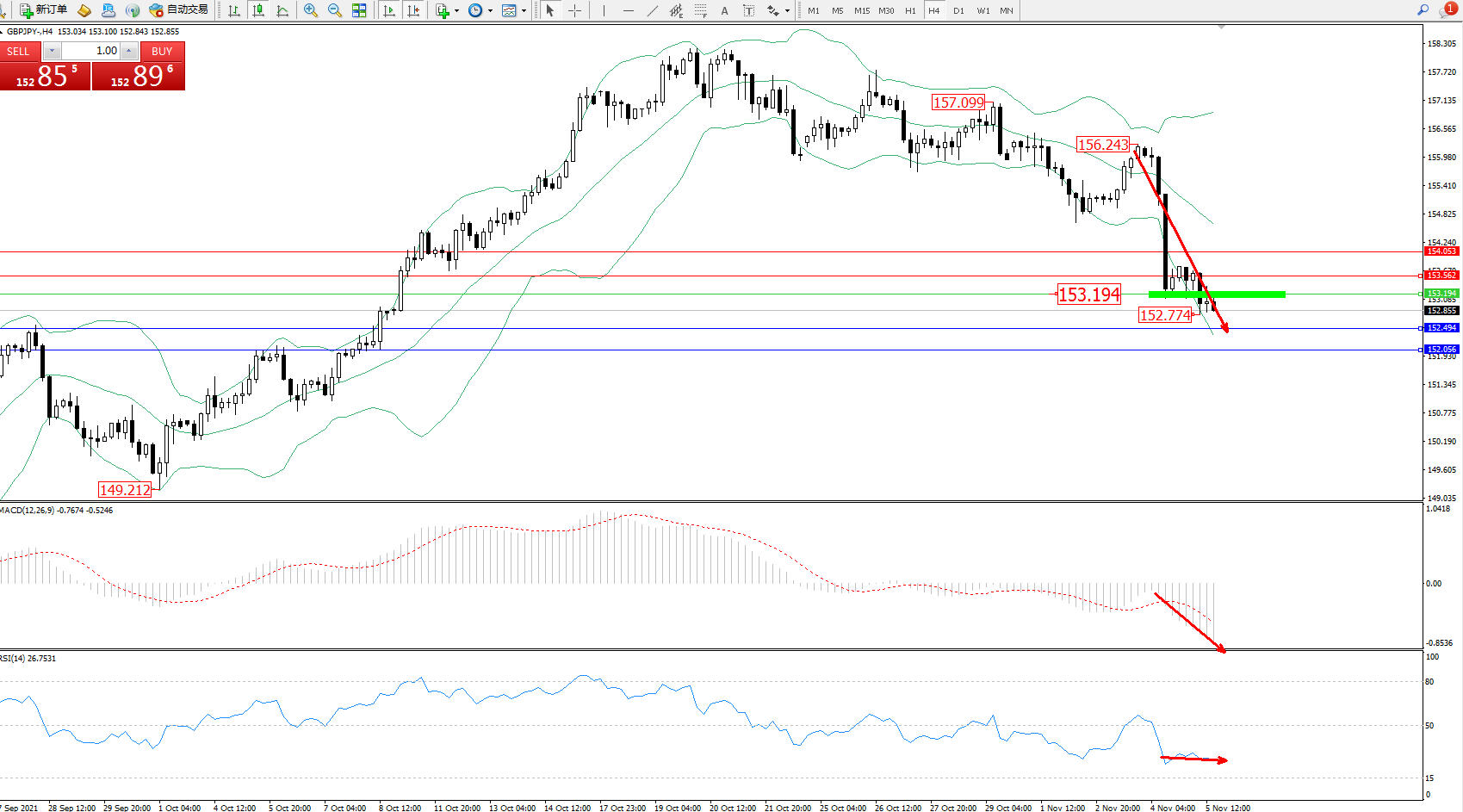 交易策略:153.194下方看跌,目标152.494、152.056