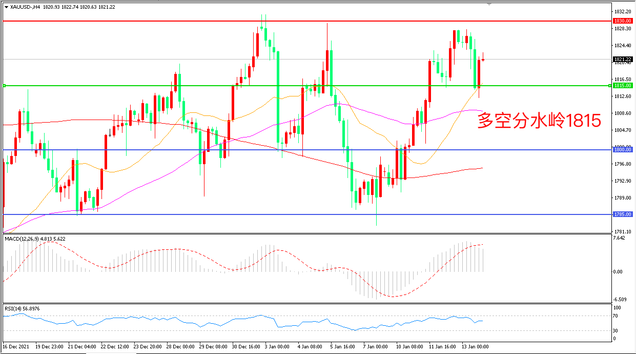 4小时图看,金价突破1815阻力关口后连续拉升,短期走势偏强,21周期均线成为下方支撑, MACD红柱增加,RSI指标走平,日内震荡上行概率较大。