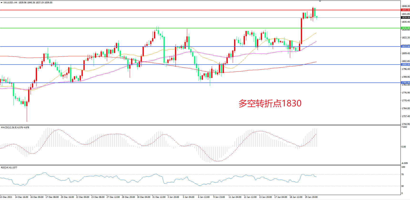 周四(1月20日),投资者都在等待美联储下周政策会议提供有关加息步伐的线索,多空双方的谨慎表现促使金价延续震荡形态,收报1838.80美元/盎司。尽管加息预期限制了金价的反弹高度,但现货黄金现在仍维持在1830美元/盎司附近且不断尝试上探,目前乌克兰局势持续发酵,如果地缘事件向更激烈的方向发展,金价可能会受到避险情绪支撑再度上行。