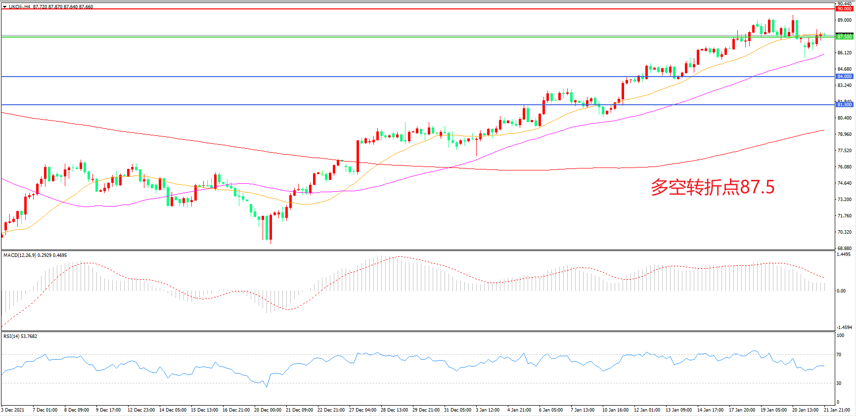 4小时图看,油价连续上行后小幅回落,但上行趋势依然未受到破坏,55周期均线成为下方支撑,87.5美元成为多空分水岭,MACD红柱缩短,RSI指标走平,日内延续震荡概率较大。