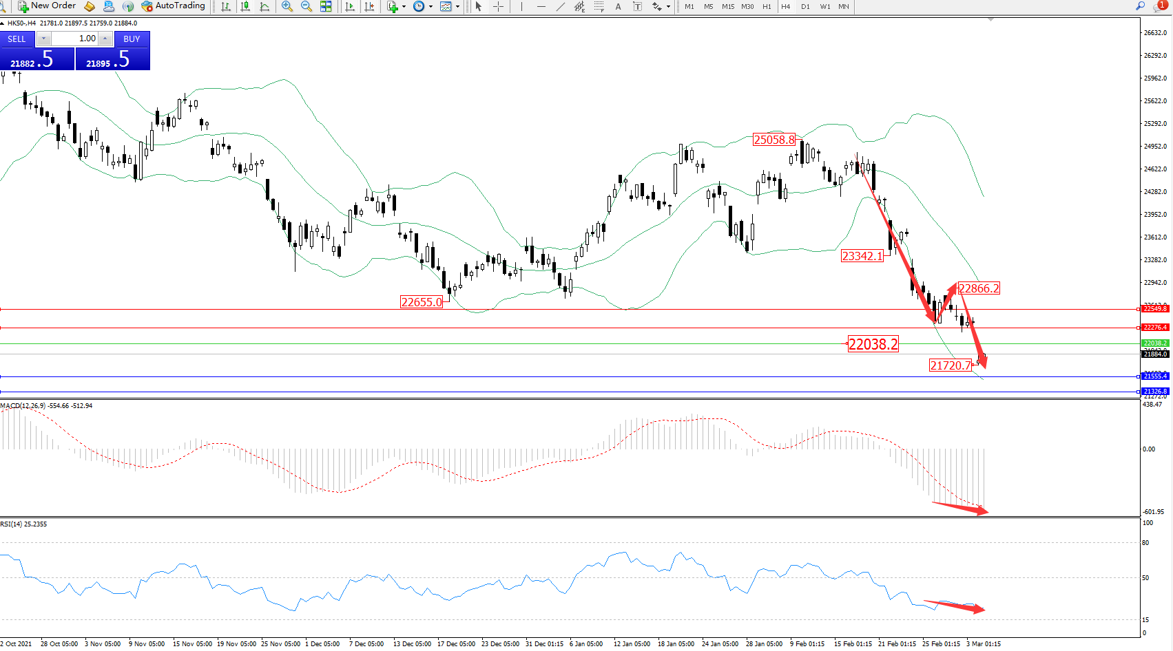 恒指HK50 ——4小时K线图显示: