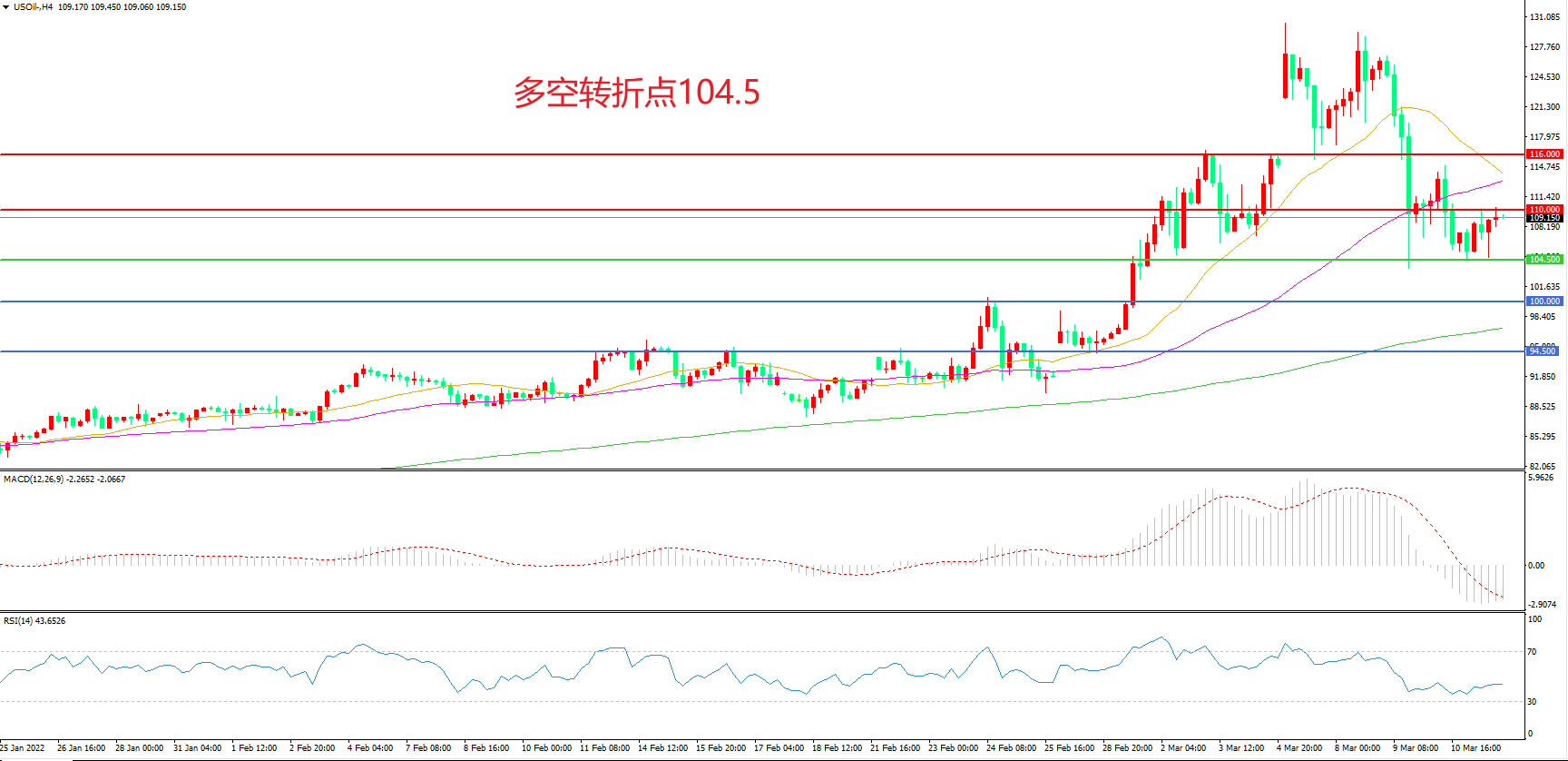 4小时图看,油价连续下破后窄幅震荡,短期走势有所企稳,104.5美元成为多空分水岭,MACD红柱缩短,RSI指标走平,日内延续震荡概率较大。