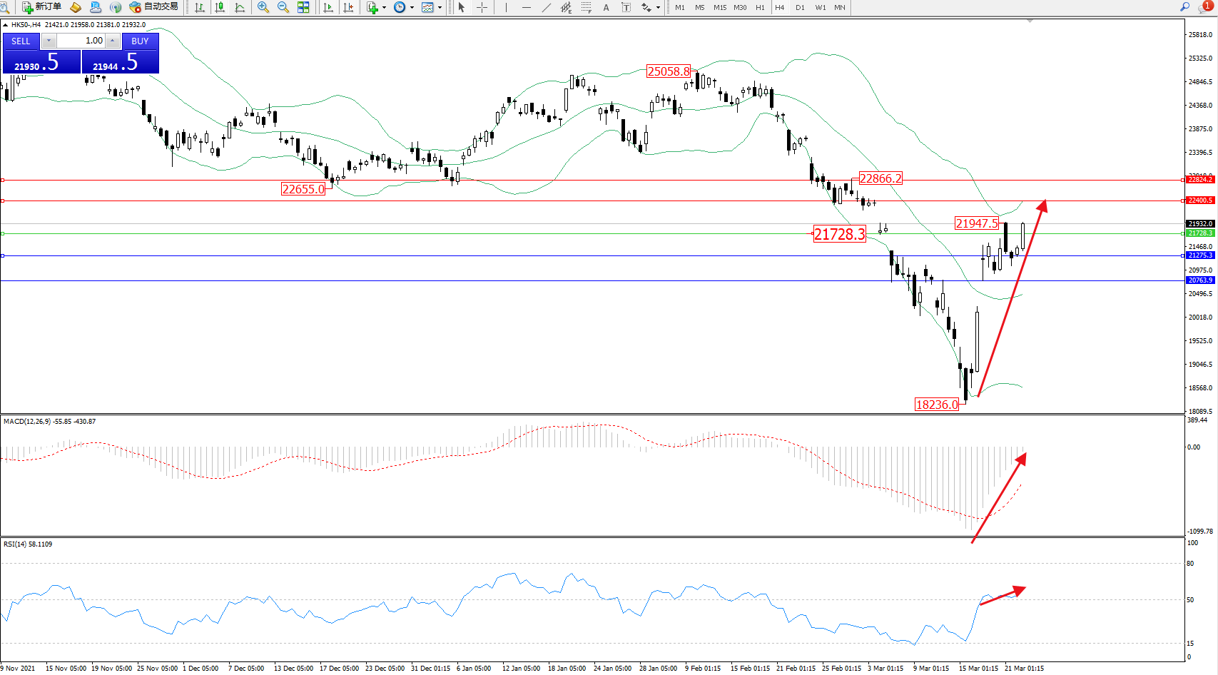 恒指HK50 ——4小时K线图显示: