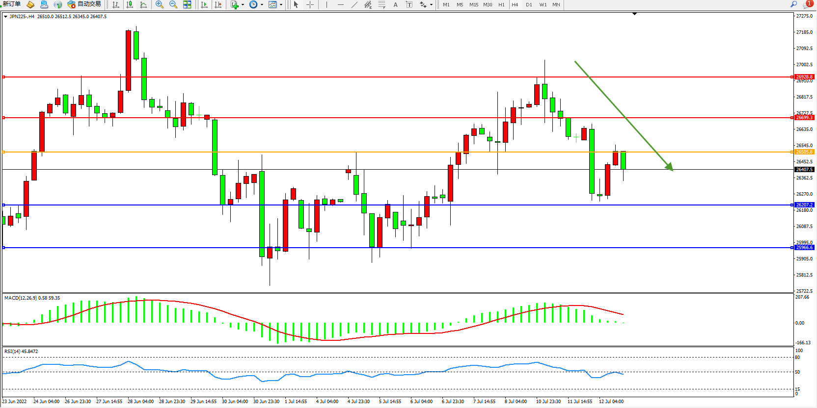 日经225指数7月12日(周二)收盘下跌488.80点,跌幅1.82%,报26323.50点。日本财务大臣铃木俊一:希望与美国财长耶伦讨论G20峰会的各种问题。市场消息:美国财长耶伦和日本财务大臣铃木俊一讨论了供应链和对俄制裁问题。