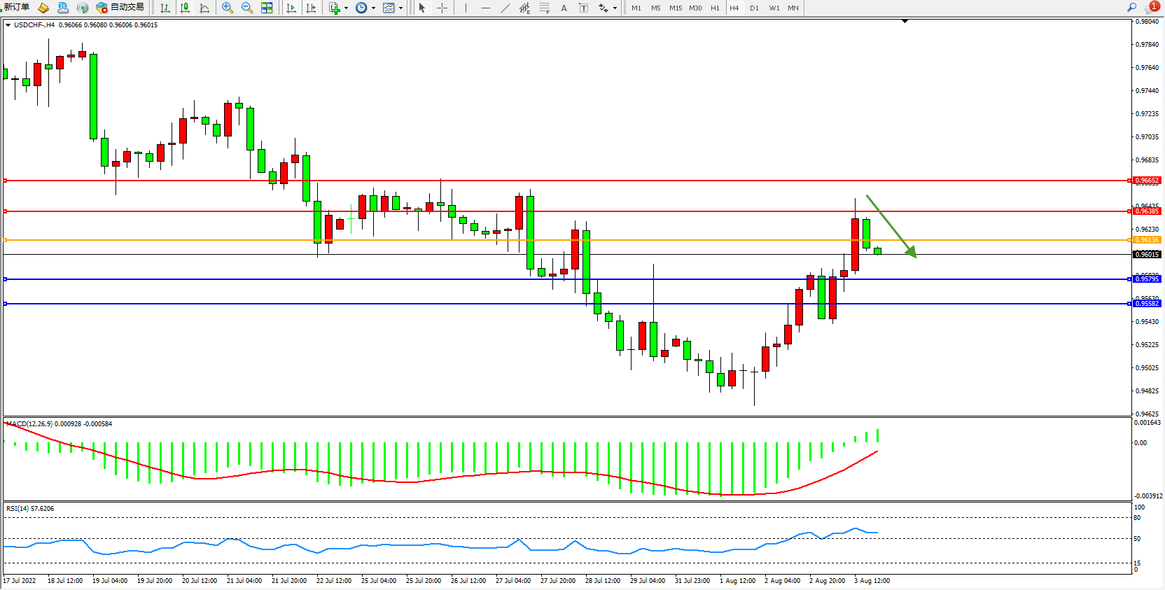 美元瑞郎USDCHF——4小时K线图显示: