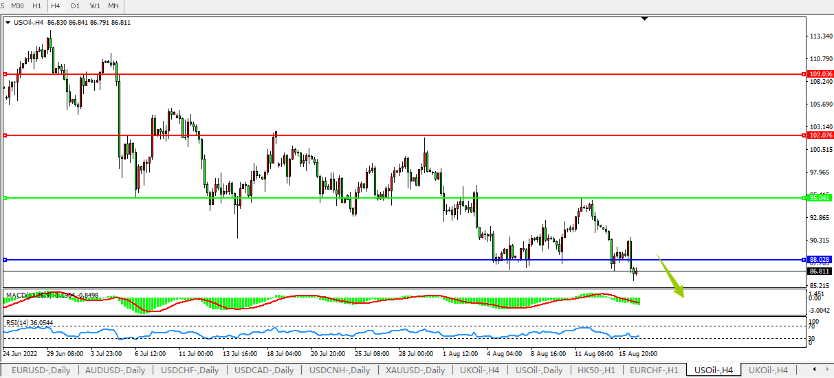 4小时图看:油价小幅反弹后再度下行, MACD量能柱0轴下方放量,RSI指标快速回落,短期价格反弹后再度下行概率较大。