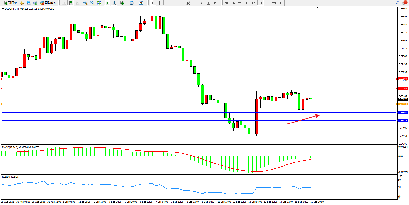 美元瑞郎USDCHF——4小时K线图显示: