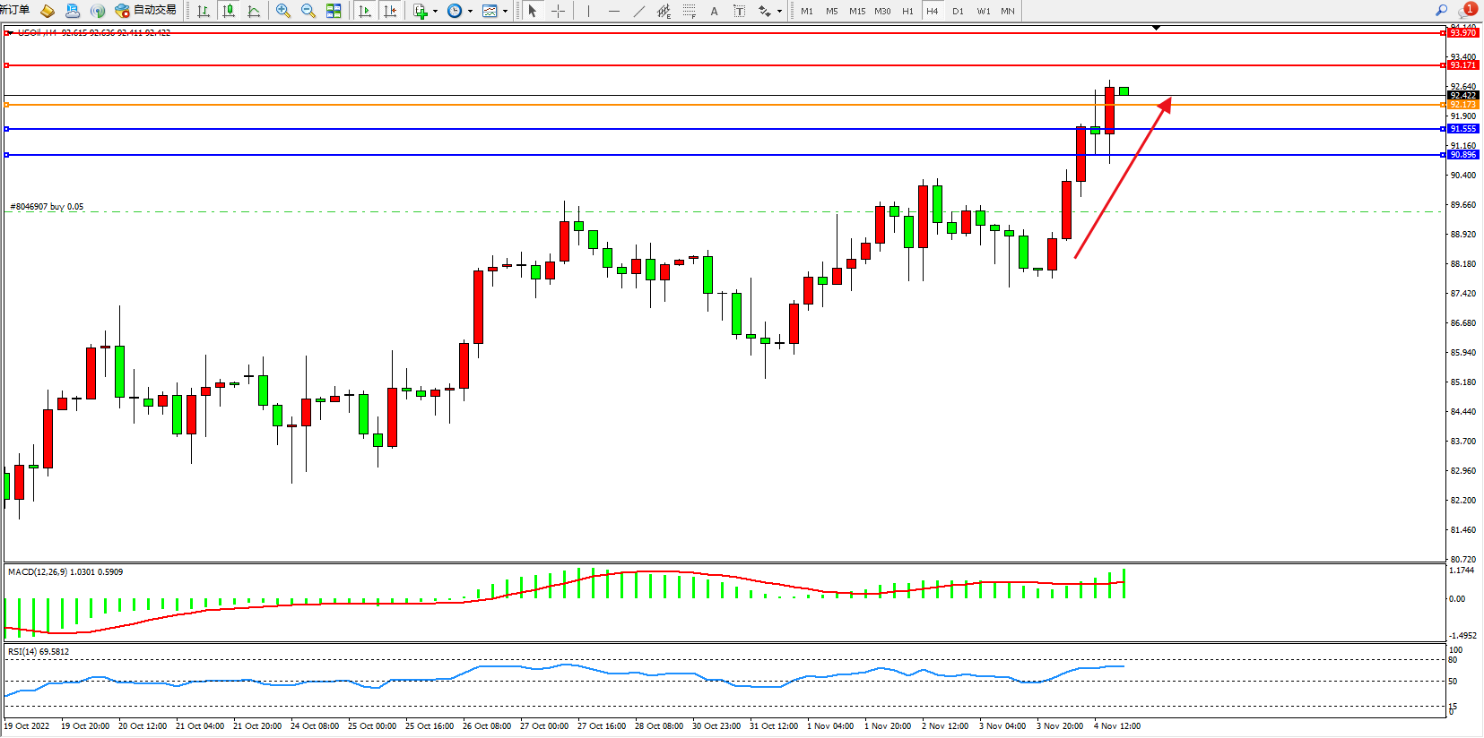 交易策略:92.173上方看涨,目标93.171、93.970