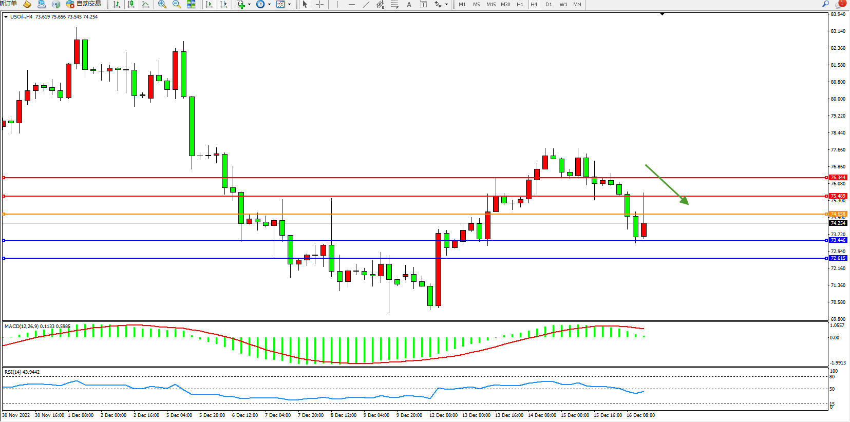 交易策略:74.658下方看跌,目标73.446、72.615