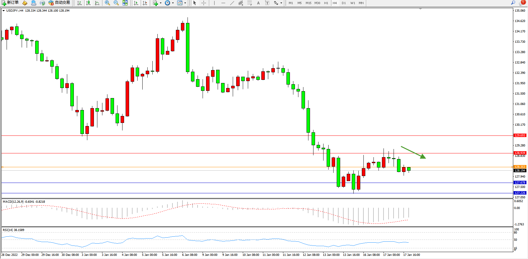 交易策略:128.353下方看跌,目标127.678、127.226