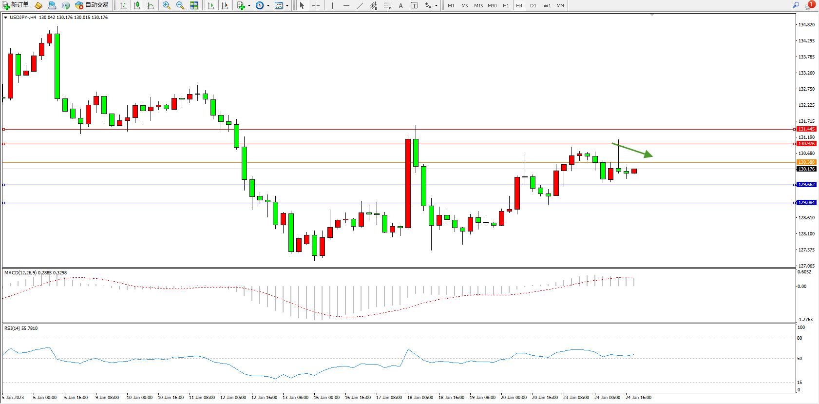交易策略:130.388下方看跌,目标129.662、129.084