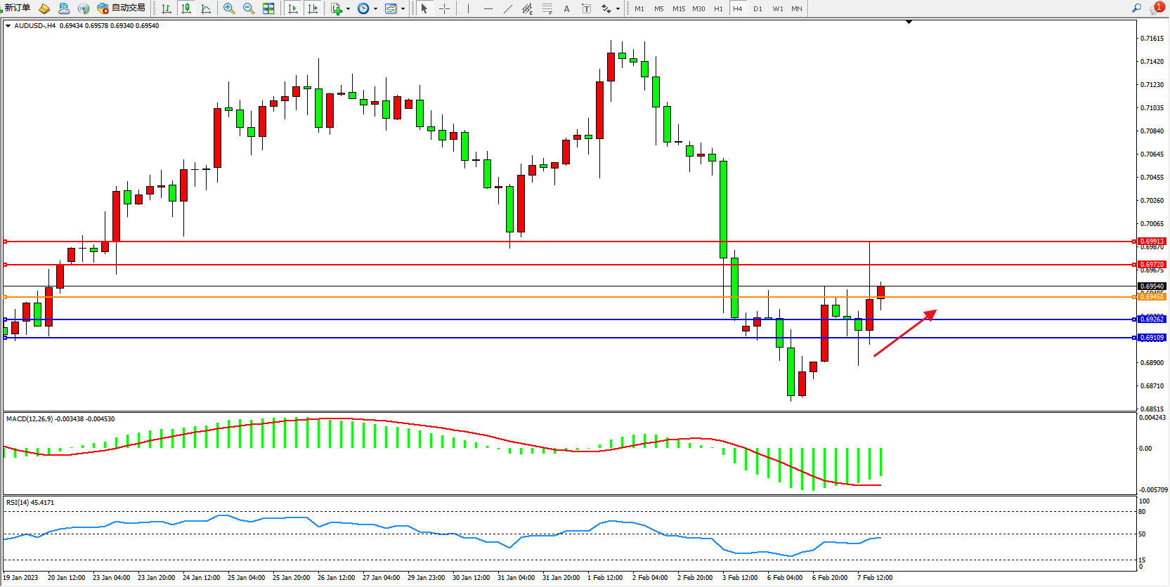 交易策略:0.69450上方看涨,目标0.69262、0.69109