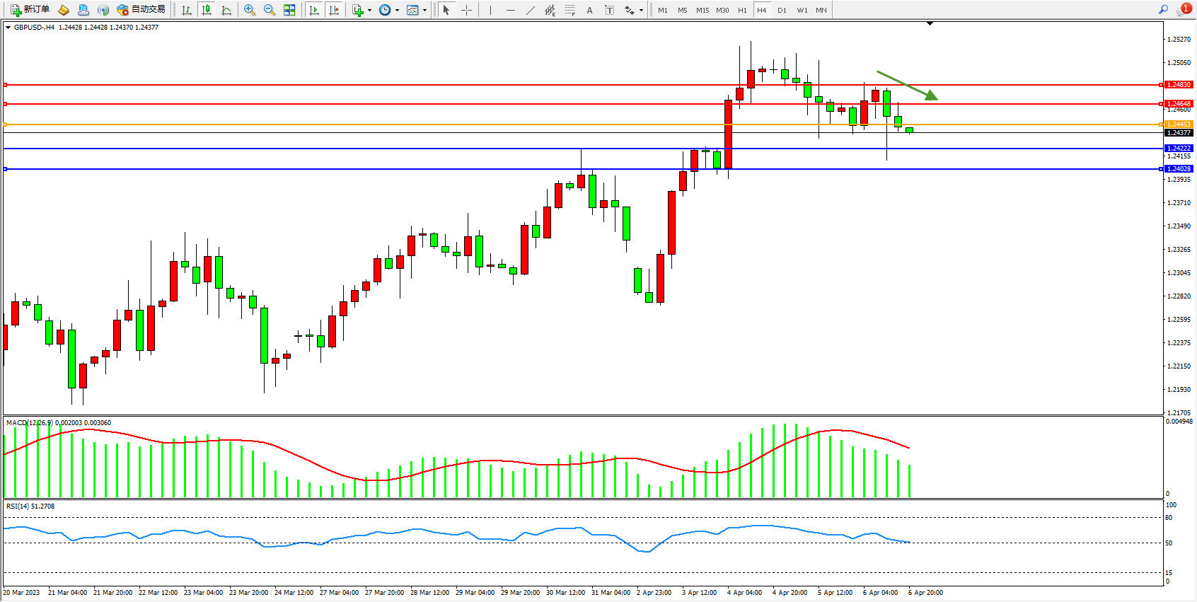 4小时图看:高位空头下行,短期跌势或将延续,市场空头情绪涌现,MACD指标处于多头区域持续下行,RSI指标处于50均衡线附近弱势徘徊;