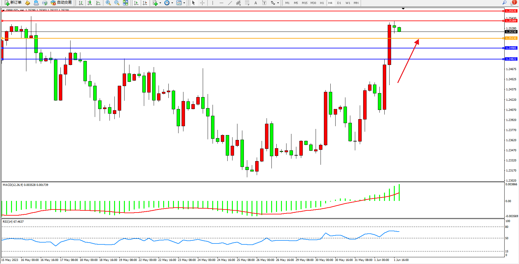 交易策略:1.25130上方看涨,目标1.25389  1.25535